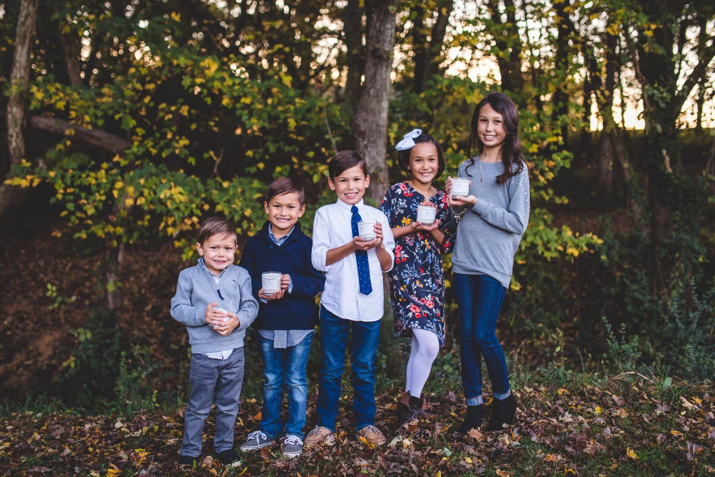 We are the Shak kids, five siblings working together to create beautifully hand-crafted candles with love and laughter. Our candle company started because we wanted a puppy. Our Dad said, “Only if you can earn one.” That sparked a fire and we were determined to take on his challenge. It took us quite some time to come up with a product that we love, but in less than a year we earned our puppy. Her name is Gracie Mae and she’s so cute and adorable! Before we knew it, an actual company was established in the process. Since we achieved our initial goal, we have a new mission to simply have our products bring joy and peace to others (and maybe set aside some savings for college as well). Our workshop is located in our mom and dad’s kitchen in Matthews, NC. All of our candles are thoughtfully made with scents that touch our hearts. There are five main scents named after each of us and crafted from our individual personalities. We have become passionate about each unique candle. They are made in small batches and are individually hand poured, to create high quality. But sometimes there is a slight imperfection, just like us. They are clean burning, made with pure soy wax, lead-free cotton wicks, and phthalate free fragrances (because we don’t like chemicals). Our candles are pleasing to your senses, yet not harmful to your home and environment, because your wellbeing is important to us.